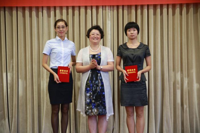 9、集團(tuán)總裁助理、工會主席王育青(中)為一等獎獲得者頒獎。