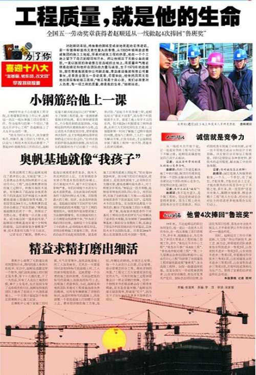 在黨的十八大即將召開(kāi)前夕,青島報(bào)業(yè)集團(tuán)推出“喜迎十八大”專版,報(bào)道青島各行各業(yè)一批先進(jìn)人物,在平凡崗位上做出的不平凡事跡,10月14日,《青島早報(bào)》A5版以《工程質(zhì)量 就是他的生命》為題,整版報(bào)道集團(tuán)股份公司副總裁、青島建設(shè)集團(tuán)有限公司董事長(zhǎng)趙順廷的事跡。
