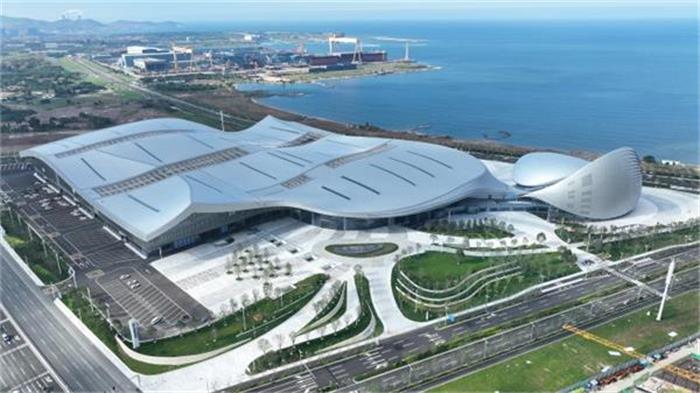 工程地下一層,地上三層,地下為鋼筋混凝土框架結(jié)構(gòu),地上為鋼框架結(jié)構(gòu),預(yù)制裝配率高達(dá)77%。“城岸云浪、海上銀貝”的建筑造型,展現(xiàn)濱海地域特色,雙曲雙層鋁板與玻璃幕墻顯得建筑大氣時(shí)尚。