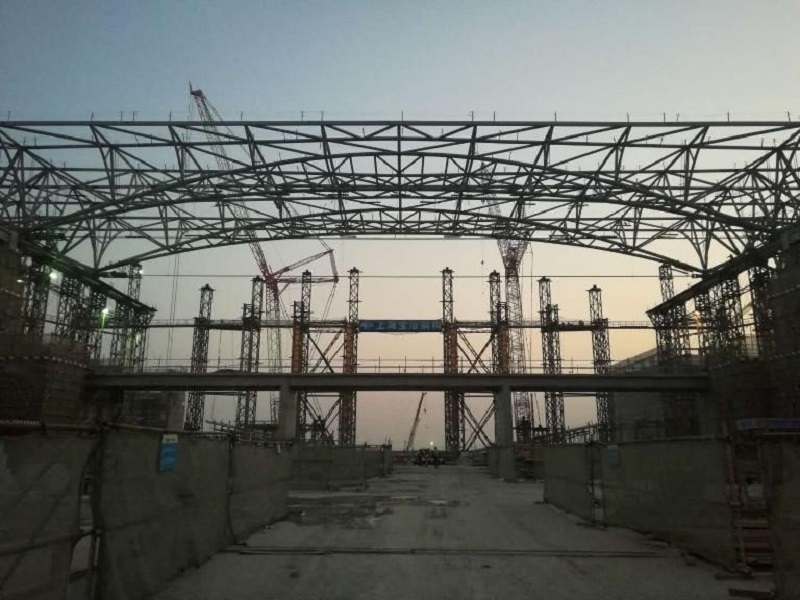 通過反復(fù)研討及技術(shù)分析,項(xiàng)目團(tuán)隊(duì)最終決定將長(zhǎng)方形鋼屋梁結(jié)構(gòu)分成八榀長(zhǎng)條結(jié)構(gòu),用吊機(jī)將第一榀吊裝至拼裝胎架連成整體,采用液壓同步滑移技術(shù)頂推一定距離后暫停,再用吊機(jī)拼裝下一榀,讓它與前部結(jié)構(gòu)形成整體。