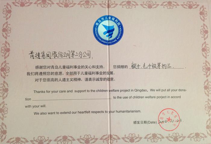 10月23日,在二分公司工會(huì)主席郭美玲帶領(lǐng)下,公司一行前往青島兒童福利院“藍(lán)天之家”,代表公司領(lǐng)導(dǎo)及全體員工為福利院兒童獻(xiàn)出愛(ài)心。