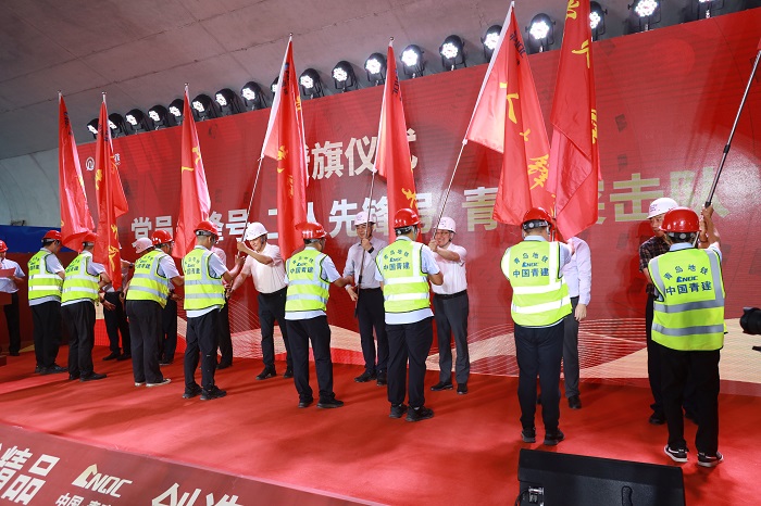儀式上,出席領(lǐng)導(dǎo)為集團(tuán)地鐵7號線項(xiàng)目部授予黨員先鋒號、工人先鋒號、青年突擊隊(duì)旗幟。