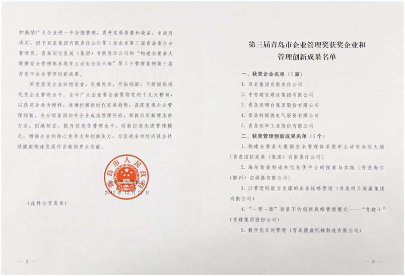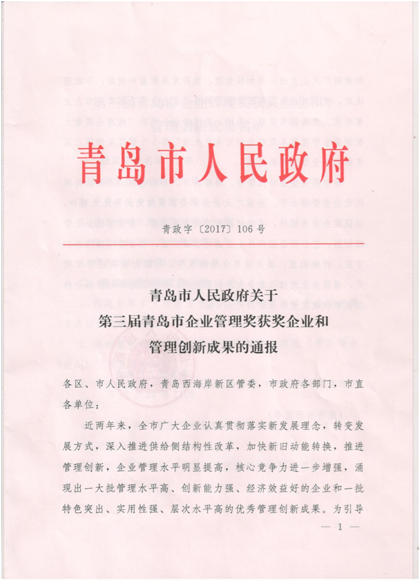 “青島市企業(yè)管理創(chuàng)新成果獎”是青島市政府2013年設(shè)立的企業(yè)管理領(lǐng)域最高獎項(xiàng)。該獎由市政府頒發(fā),每兩年評選一次,每次評出5家企業(yè)和5項(xiàng)成果。