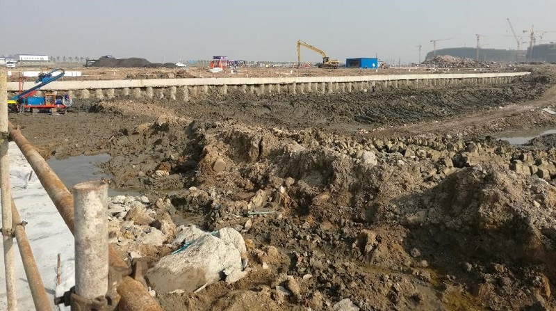 中國·紅島國際會議展覽中心項目所在區(qū)域最早屬于海鹽生產(chǎn)基地,后來為蝦魚養(yǎng)殖池,淤泥厚度達(dá)到了7米,基本上處于流塑狀態(tài),穩(wěn)定性極差,同時地下水位高,腐蝕性很強(qiáng),這對項目的基坑開挖、場區(qū)的軟基處理以及基礎(chǔ)工程施工帶來了巨大的影響。而對于一個建筑而言,下層基礎(chǔ)決定上層建筑,如何高品質(zhì)的打好基礎(chǔ)且不受自然地貌影響,這一掘一固尤為重要。